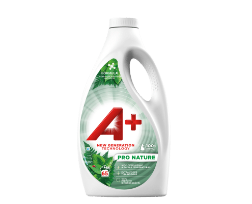 Pelo bem do nosso meio ambiente desenvolvemos um novo detergente formulado com ingredientes naturais e perfume biodegradável. A+ Líquido Pro Nature está disponível numa garrafa de plástico 100% reciclada e reciclável. Vamos fazer + pelo nosso planeta!