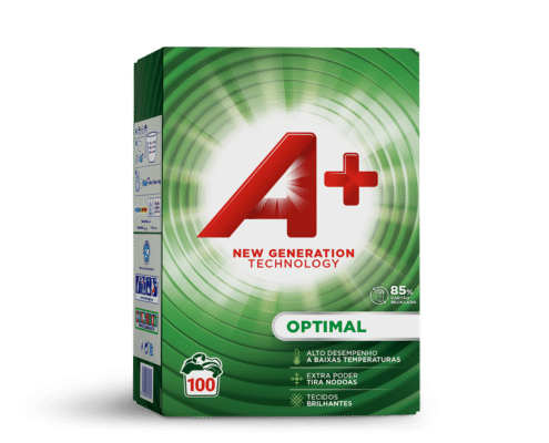 A+ Pó Optimal. É o detergente em pó ideal, para quem procura uma solução mais económica, pois para além de ser um detergente que é eficaz em água fria, é também indicado para quem prefere ciclos curtos.
